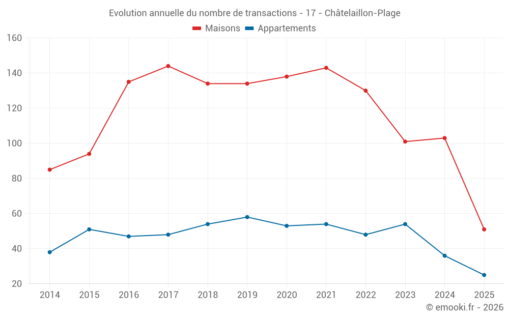 Le prix médian sur les 51 transactions de maisons des 6 derniers mois dans la commune de Châtelaillon-Plage était de 4 438 € par mètre carré pour une valeur foncière médiane de 360 000 €. Sur cette période 60% des transactions se sont situées entre 3 566 et 5 392 € par mètre carré (du 2ème au 8ème déciles).