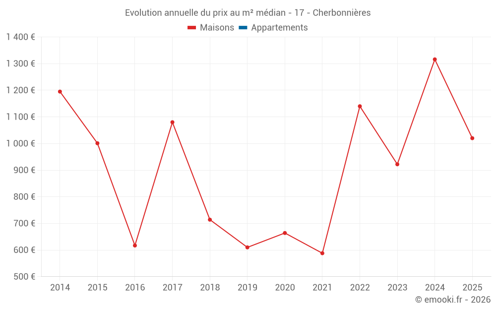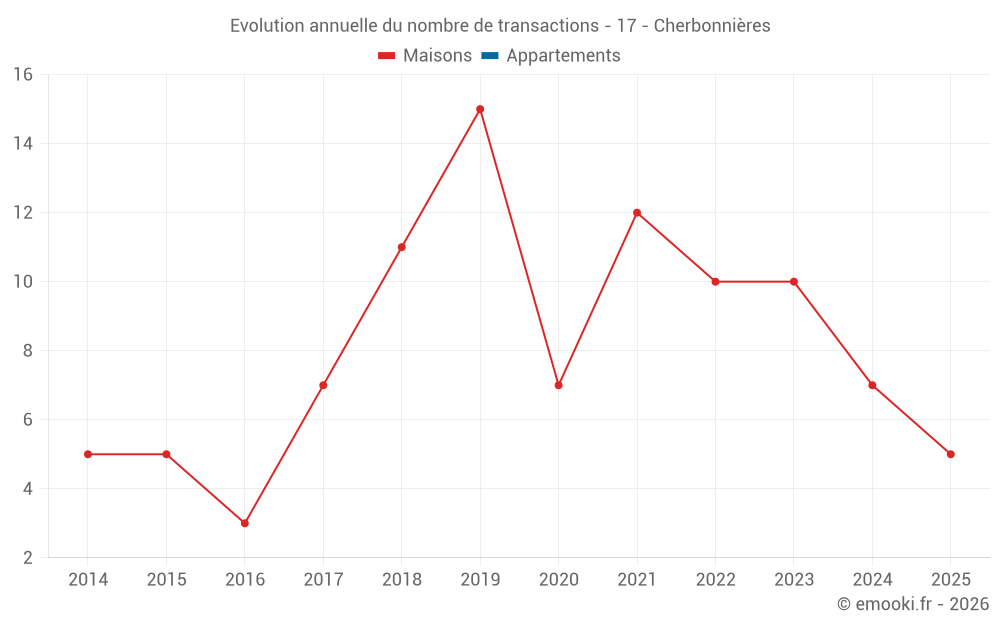 Le prix médian sur les 15 transactions de maisons des 24 derniers mois dans la commune de Cherbonnières était de 1 316 € par mètre carré pour une valeur foncière médiane de 150 000 €. Sur cette période 60% des transactions se sont situées entre 815 et 1 678 € par mètre carré (du 2ème au 8ème déciles).
