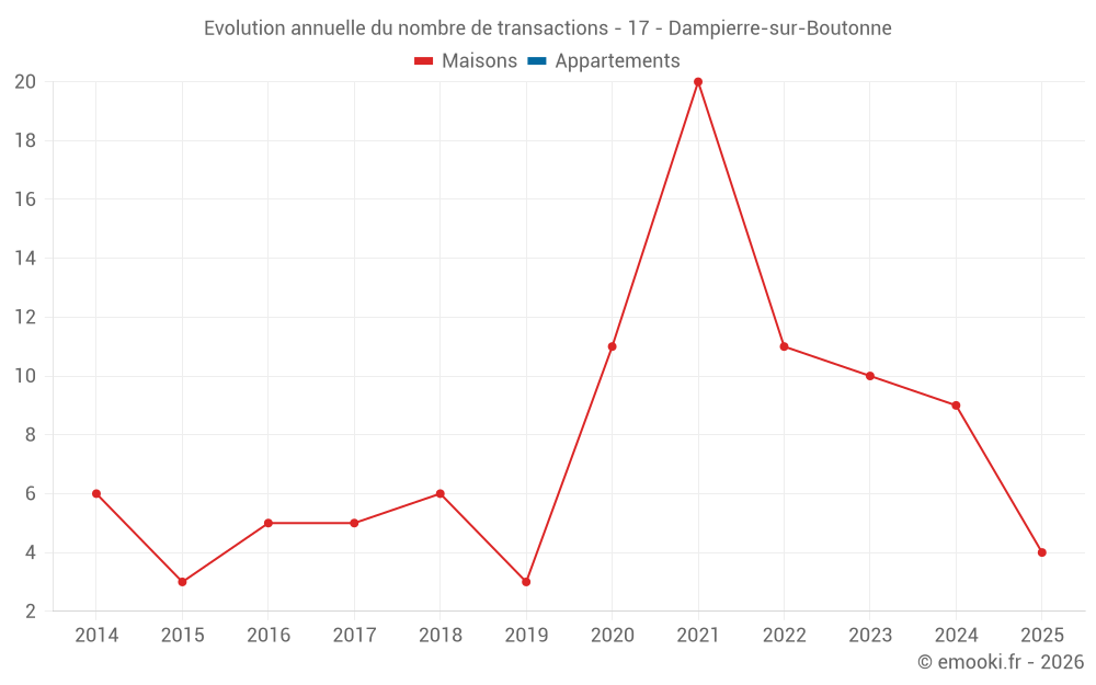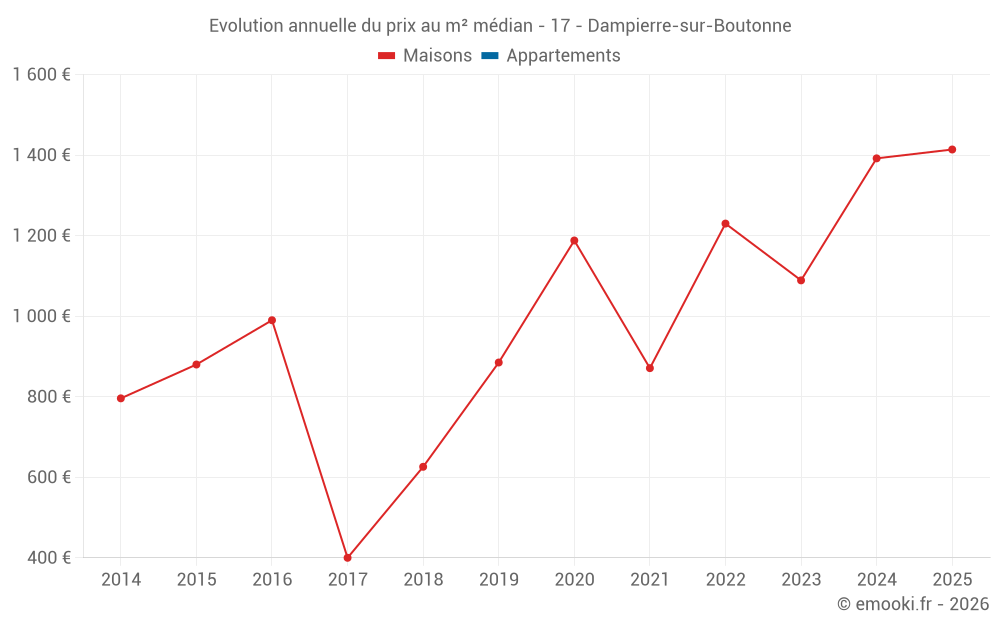 Le prix médian sur les 19 transactions de maisons des 24 derniers mois dans la commune de Dampierre-sur-Boutonne était de 1 304 € par mètre carré pour une valeur foncière médiane de 120 000 €. Sur cette période 60% des transactions se sont situées entre 638 et 1 708 € par mètre carré (du 2ème au 8ème déciles).