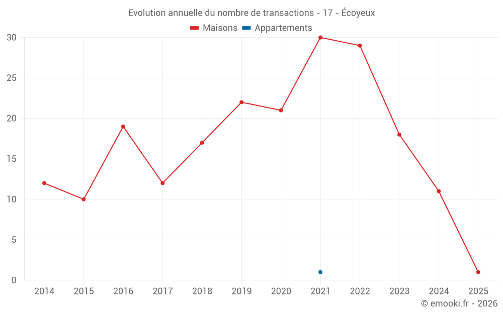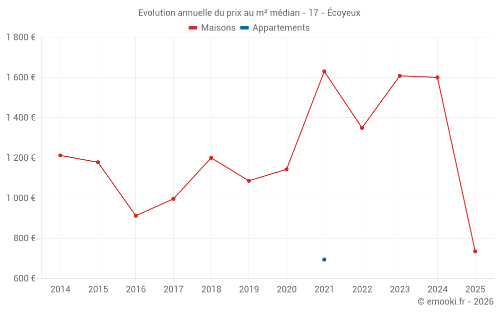 Le prix médian sur les 19 transactions de maisons des 24 derniers mois dans la commune d'Écoyeux était de 1 594 € par mètre carré pour une valeur foncière médiane de 150 000 €. Sur cette période 60% des transactions se sont situées entre 701 et 2 026 € par mètre carré (du 2ème au 8ème déciles).