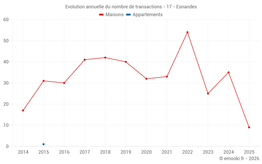 Le prix médian sur les 18 transactions de maisons des 12 derniers mois dans la commune d'Esnandes était de 2 728 € par mètre carré pour une valeur foncière médiane de 318 965 €. Sur cette période 60% des transactions se sont situées entre 2 297 et 3 499 € par mètre carré (du 2ème au 8ème déciles).