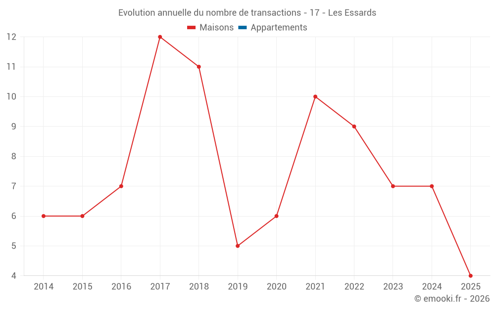 Le prix médian sur les 16 transactions de maisons des 24 derniers mois dans la commune des Essards était de 1 830 € par mètre carré pour une valeur foncière médiane de 209 000 €. Sur cette période 60% des transactions se sont situées entre 1 475 et 2 373 € par mètre carré (du 2ème au 8ème déciles).