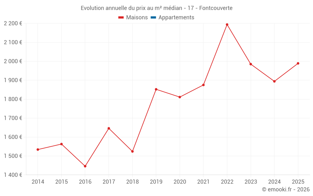 Le prix médian sur les 22 transactions de maisons des 12 derniers mois dans la commune de Fontcouverte était de 1 894 € par mètre carré pour une valeur foncière médiane de 170 000 €. Sur cette période 60% des transactions se sont situées entre 1 408 et 2 457 € par mètre carré (du 2ème au 8ème déciles).