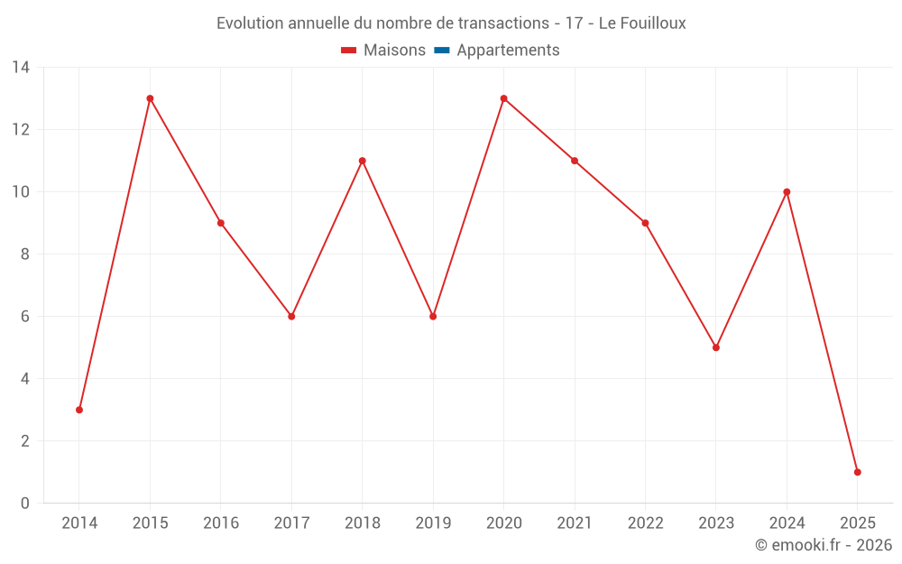 Le prix médian sur les 14 transactions de maisons des 24 derniers mois dans la commune du Fouilloux était de 926 € par mètre carré pour une valeur foncière médiane de 126 528 €. Sur cette période 60% des transactions se sont situées entre 600 et 1 499 € par mètre carré (du 2ème au 8ème déciles).
