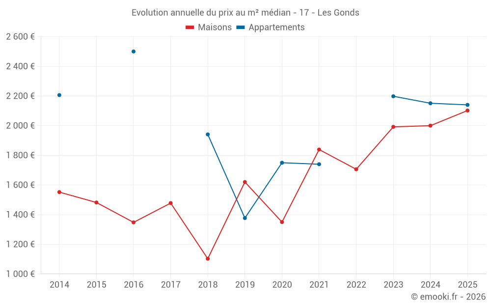 Le prix médian sur les 29 transactions de maisons des 24 derniers mois dans la commune des Gonds était de 1 971 € par mètre carré pour une valeur foncière médiane de 199 000 €. Sur cette période 60% des transactions se sont situées entre 1 550 et 2 396 € par mètre carré (du 2ème au 8ème déciles).