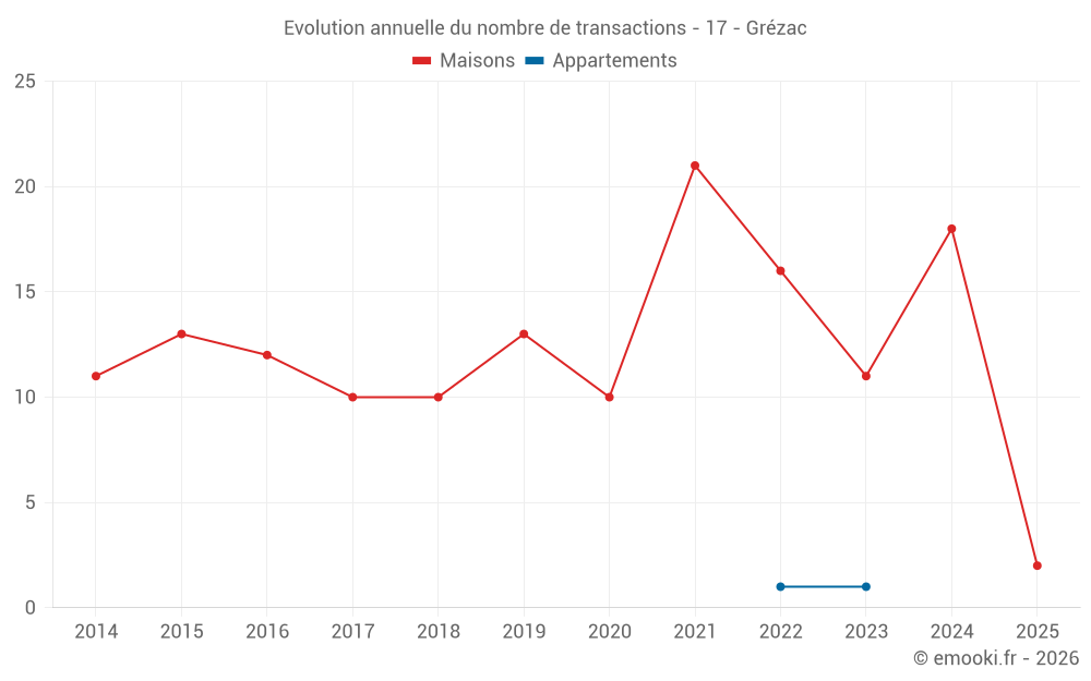 Le prix médian sur les 26 transactions de maisons des 24 derniers mois dans la commune de Grézac était de 2 160 € par mètre carré pour une valeur foncière médiane de 215 750 €. Sur cette période 60% des transactions se sont situées entre 1 650 et 2 662 € par mètre carré (du 2ème au 8ème déciles).