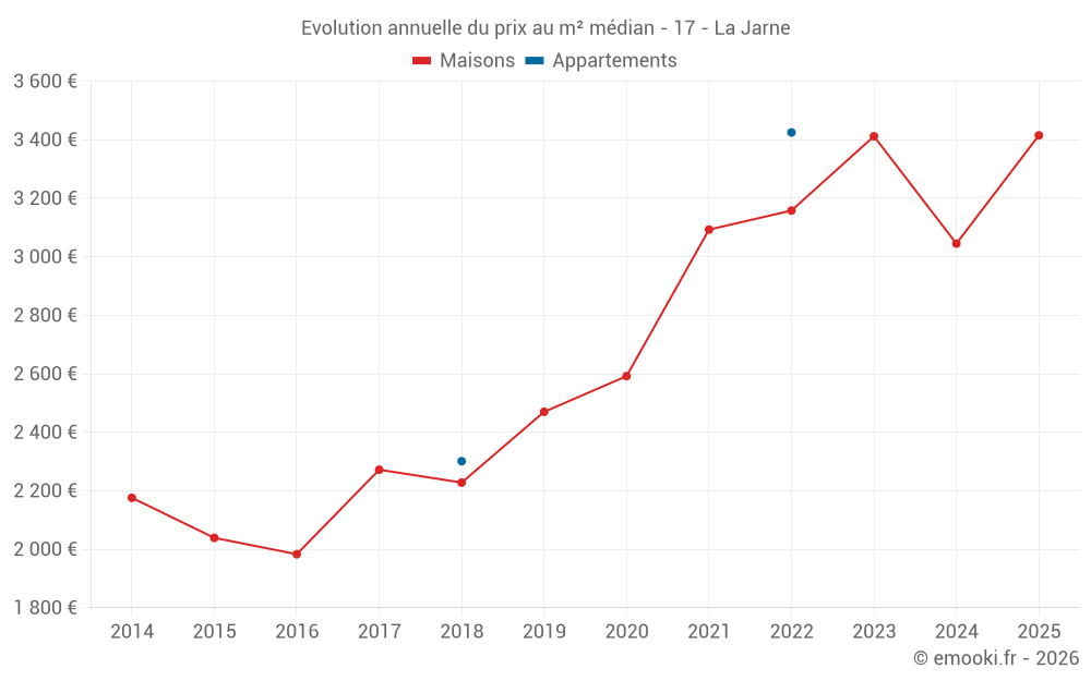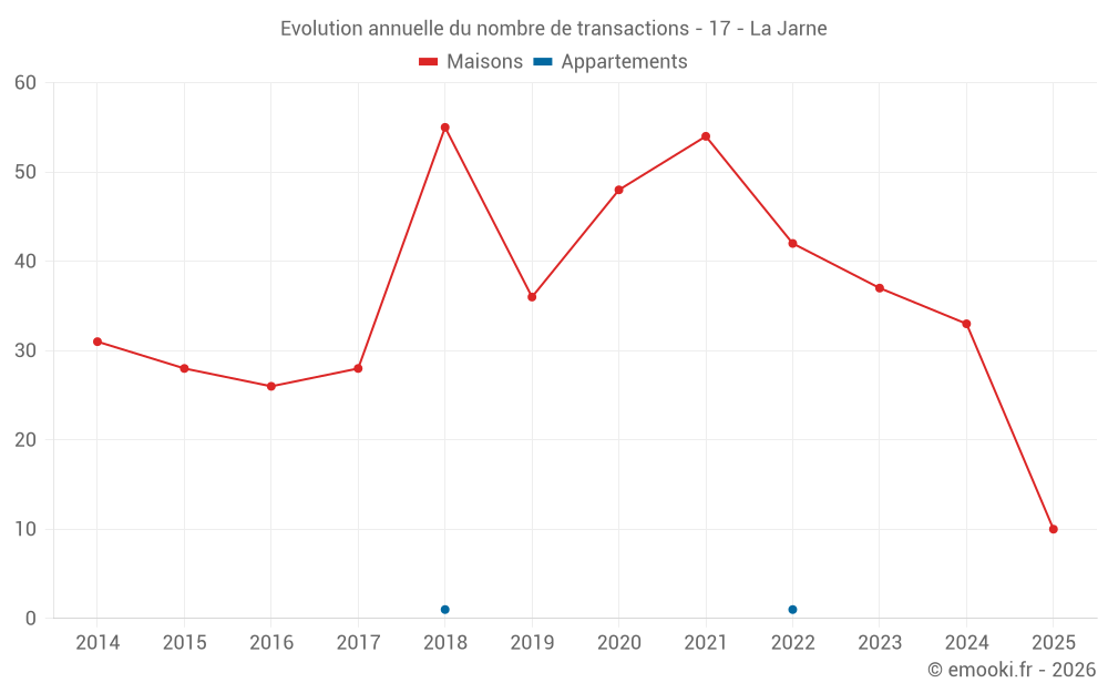 Le prix médian sur les 27 transactions de maisons des 12 derniers mois dans la commune de la Jarne était de 3 239 € par mètre carré pour une valeur foncière médiane de 244 262 €. Sur cette période 60% des transactions se sont situées entre 2 693 et 3 978 € par mètre carré (du 2ème au 8ème déciles).