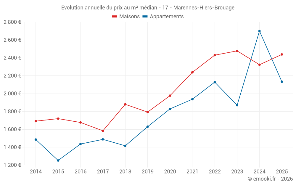 Le prix médian sur les 39 transactions de maisons des 6 derniers mois dans la commune de Marennes-Hiers-Brouage était de 2 438 € par mètre carré pour une valeur foncière médiane de 195 000 €. Sur cette période 60% des transactions se sont situées entre 1 792 et 3 095 € par mètre carré (du 2ème au 8ème déciles).