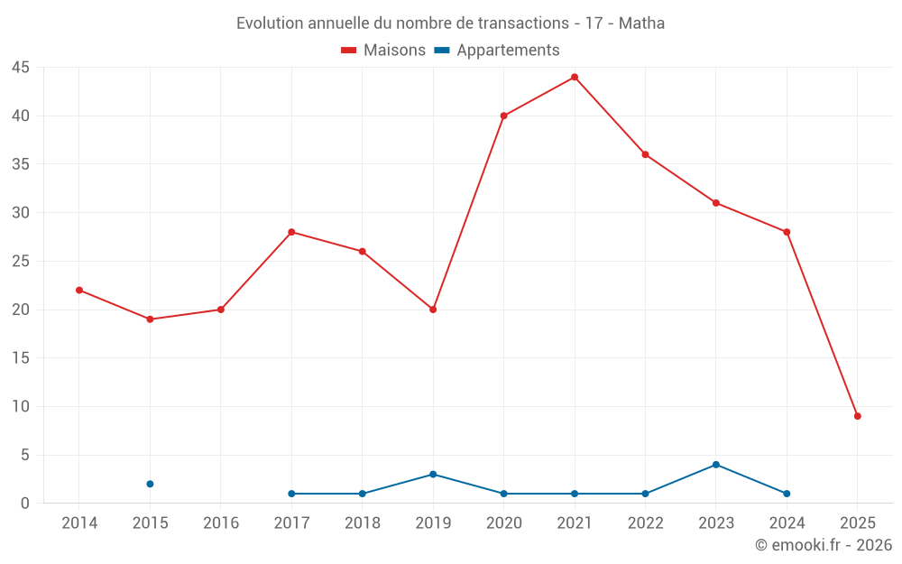 Le prix médian sur les 27 transactions de maisons des 12 derniers mois dans la commune de Matha était de 1 024 € par mètre carré pour une valeur foncière médiane de 105 000 €. Sur cette période 60% des transactions se sont situées entre 795 et 1 580 € par mètre carré (du 2ème au 8ème déciles).