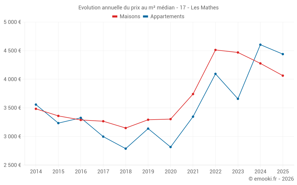Le prix médian sur les 36 transactions de maisons des 6 derniers mois dans la commune des Mathes était de 4 064 € par mètre carré pour une valeur foncière médiane de 266 250 €. Sur cette période 60% des transactions se sont situées entre 3 270 et 5 263 € par mètre carré (du 2ème au 8ème déciles).