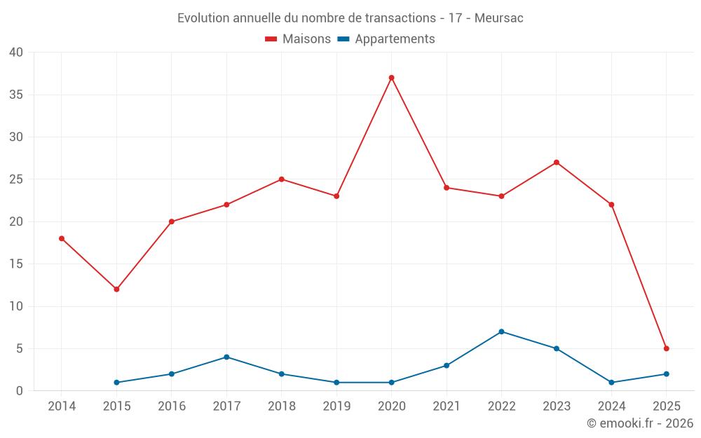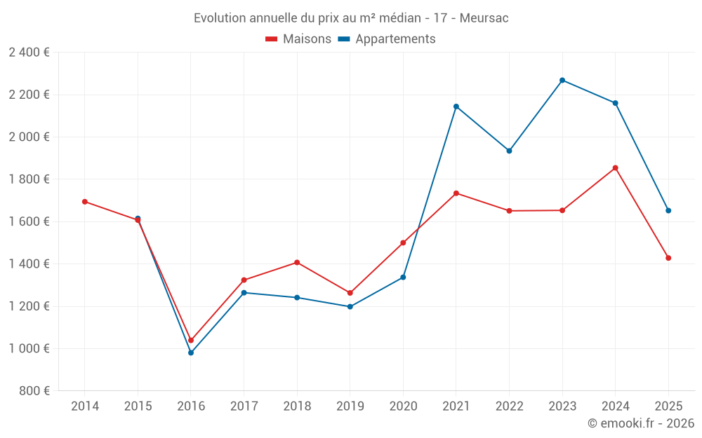 Le prix médian sur les 21 transactions de maisons des 12 derniers mois dans la commune de Meursac était de 1 838 € par mètre carré pour une valeur foncière médiane de 195 000 €. Sur cette période 60% des transactions se sont situées entre 1 438 et 2 621 € par mètre carré (du 2ème au 8ème déciles).