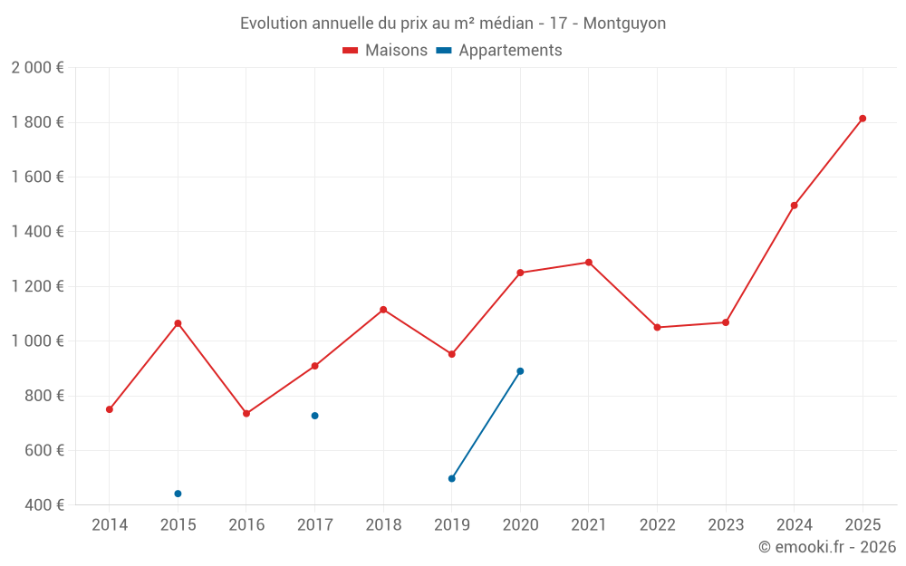 Le prix médian sur les 20 transactions de maisons des 12 derniers mois dans la commune de Montguyon était de 1 628 € par mètre carré pour une valeur foncière médiane de 135 094 €. Sur cette période 60% des transactions se sont situées entre 1 099 et 1 835 € par mètre carré (du 2ème au 8ème déciles).
