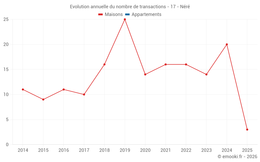 Le prix médian sur les 31 transactions de maisons des 24 derniers mois dans la commune de Néré était de 938 € par mètre carré pour une valeur foncière médiane de 100 000 €. Sur cette période 60% des transactions se sont situées entre 563 et 1 300 € par mètre carré (du 2ème au 8ème déciles).