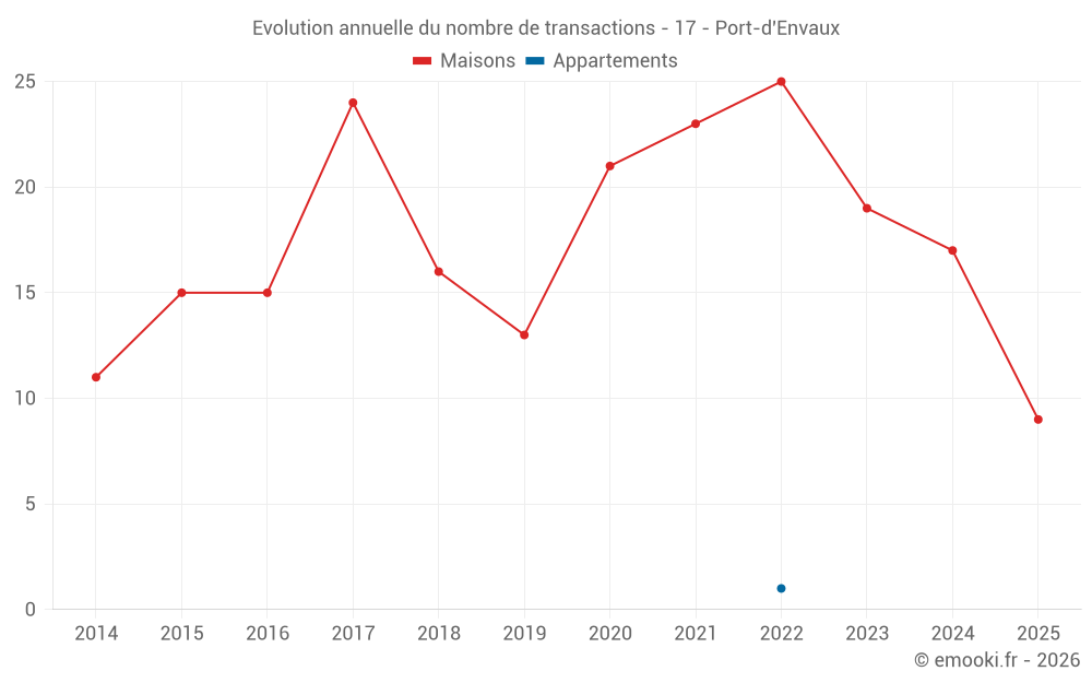 Le prix médian sur les 18 transactions de maisons des 12 derniers mois dans la commune de Port-d'Envaux était de 1 688 € par mètre carré pour une valeur foncière médiane de 192 250 €. Sur cette période 60% des transactions se sont situées entre 1 356 et 2 070 € par mètre carré (du 2ème au 8ème déciles).