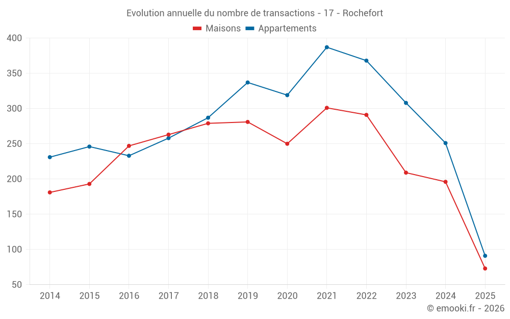 Le prix médian sur les 30 transactions d'appartements des 3 derniers mois dans la commune de Rochefort était de 2 050 € par mètre carré pour une valeur foncière médiane de 95 000 €. Sur cette période 60% des transactions se sont situées entre 1 751 et 3 064 € par mètre carré (du 2ème au 8ème déciles).