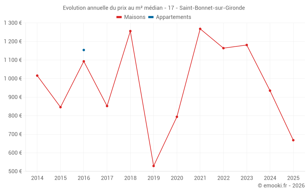 Le prix médian sur les 27 transactions de maisons des 24 derniers mois dans la commune de Saint-Bonnet-sur-Gironde était de 961 € par mètre carré pour une valeur foncière médiane de 107 500 €. Sur cette période 60% des transactions se sont situées entre 672 et 1 618 € par mètre carré (du 2ème au 8ème déciles).