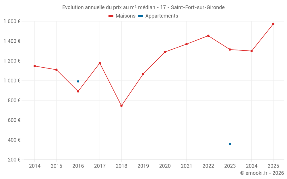 Le prix médian sur les 37 transactions de maisons des 24 derniers mois dans la commune de Saint-Fort-sur-Gironde était de 1 366 € par mètre carré pour une valeur foncière médiane de 125 000 €. Sur cette période 60% des transactions se sont situées entre 1 021 et 1 846 € par mètre carré (du 2ème au 8ème déciles).