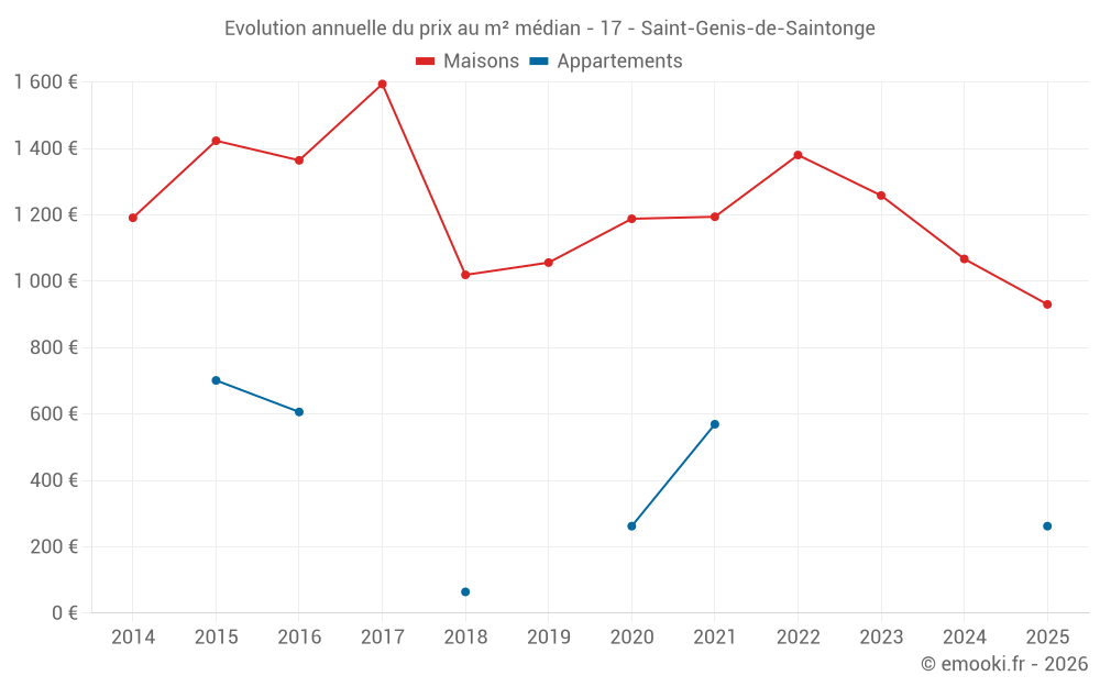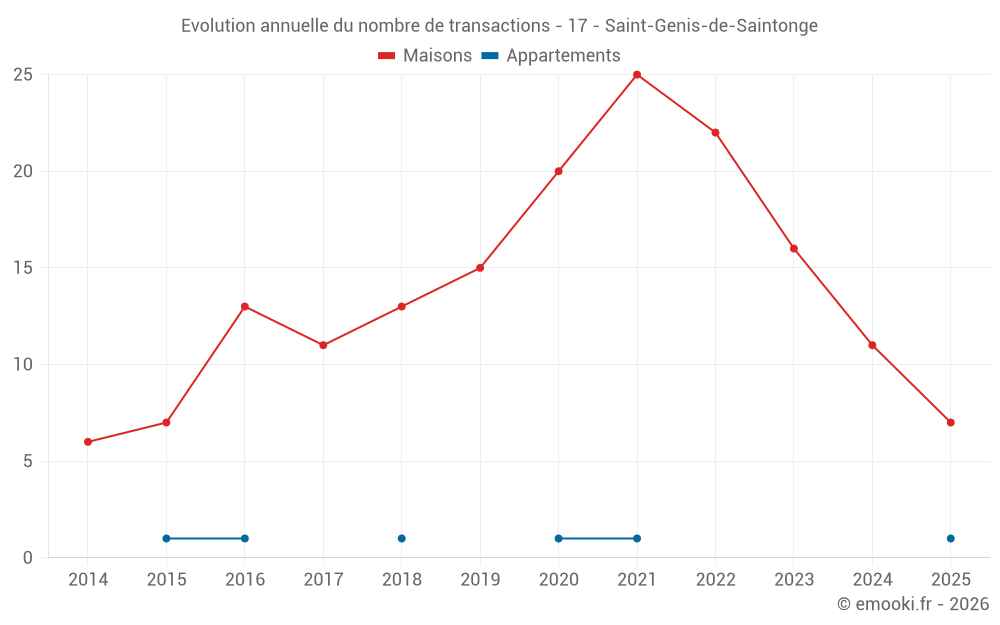 Le prix médian sur les 25 transactions de maisons des 24 derniers mois dans la commune de Saint-Genis-de-Saintonge était de 1 180 € par mètre carré pour une valeur foncière médiane de 120 000 €. Sur cette période 60% des transactions se sont situées entre 759 et 1 878 € par mètre carré (du 2ème au 8ème déciles).