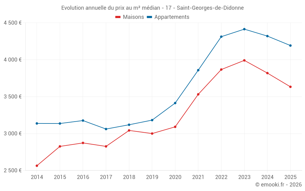 Le prix médian sur les 25 transactions d'appartements des 6 derniers mois dans la commune de Saint-Georges-de-Didonne était de 4 192 € par mètre carré pour une valeur foncière médiane de 141 000 €. Sur cette période 60% des transactions se sont situées entre 3 469 et 4 953 € par mètre carré (du 2ème au 8ème déciles).