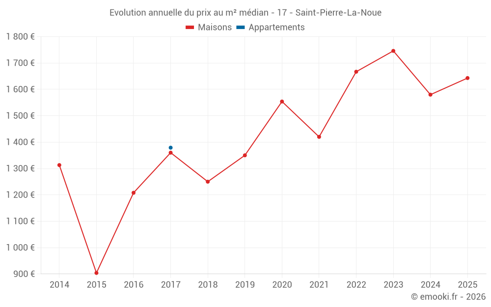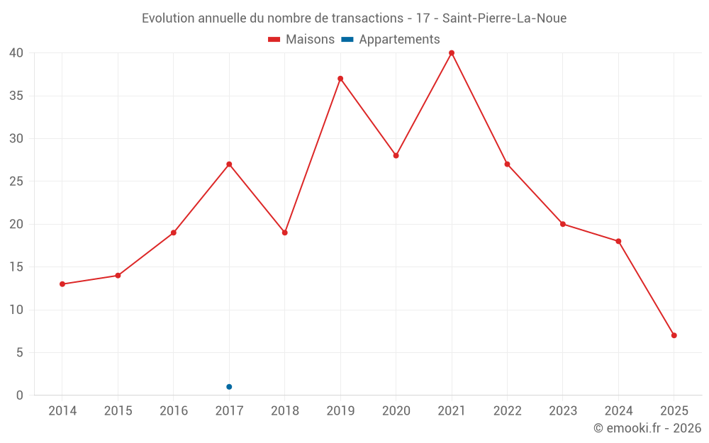 Le prix médian sur les 22 transactions de maisons des 12 derniers mois dans la commune de Saint-Pierre-La-Noue était de 1 629 € par mètre carré pour une valeur foncière médiane de 172 250 €. Sur cette période 60% des transactions se sont situées entre 922 et 2 128 € par mètre carré (du 2ème au 8ème déciles).