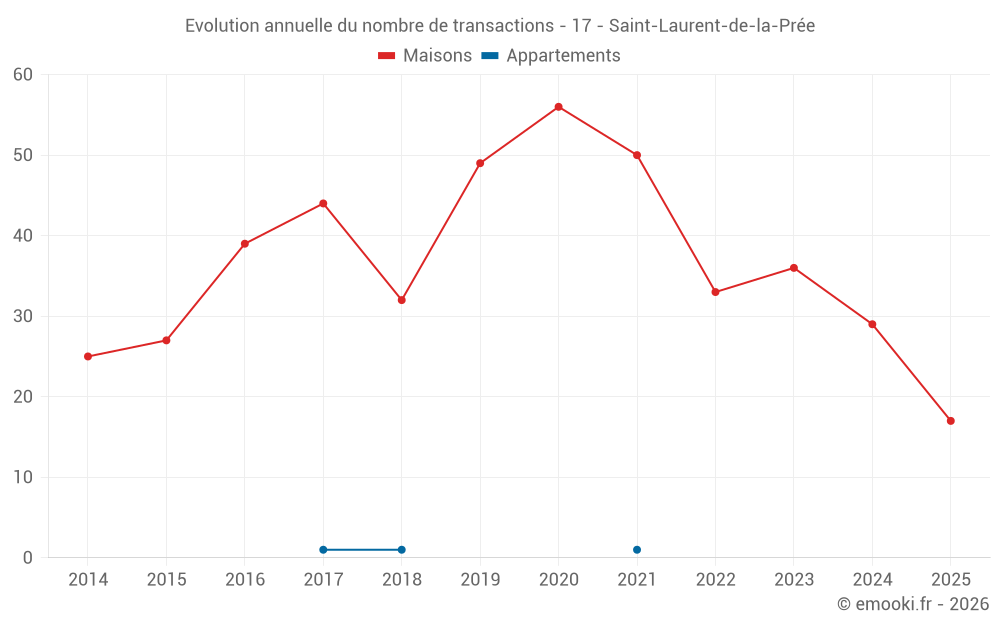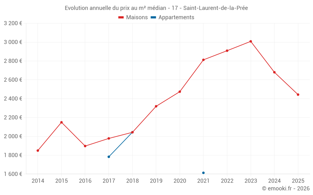 Le prix médian sur les 31 transactions de maisons des 12 derniers mois dans la commune de Saint-Laurent-de-la-Prée était de 2 469 € par mètre carré pour une valeur foncière médiane de 210 000 €. Sur cette période 60% des transactions se sont situées entre 1 538 et 3 433 € par mètre carré (du 2ème au 8ème déciles).