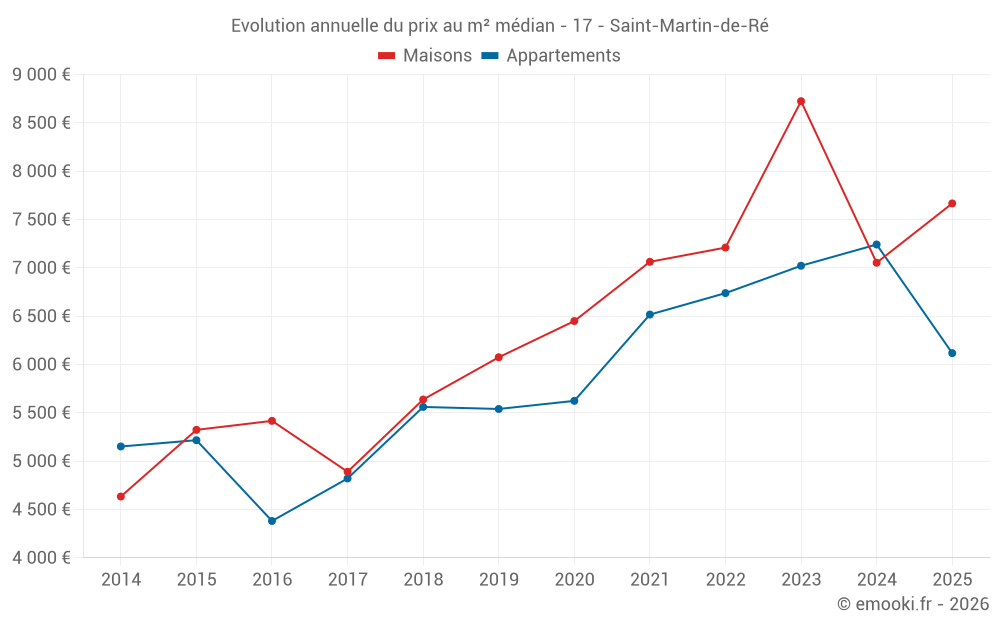 Le prix médian sur les 23 transactions de maisons des 12 derniers mois dans la commune de Saint-Martin-de-Ré était de 8 159 € par mètre carré pour une valeur foncière médiane de 767 000 €. Sur cette période 60% des transactions se sont situées entre 6 329 et 9 396 € par mètre carré (du 2ème au 8ème déciles).