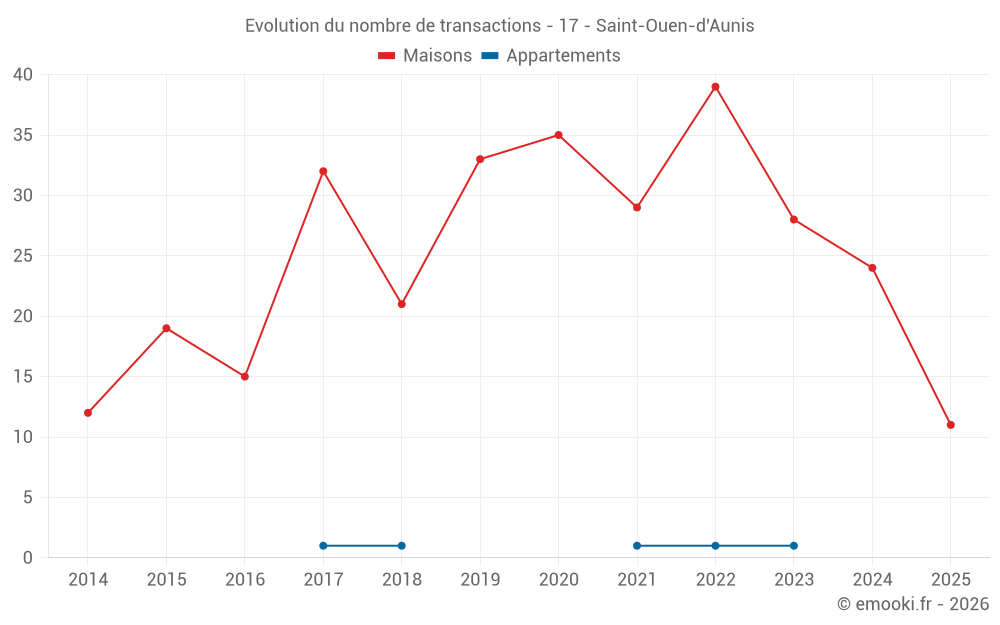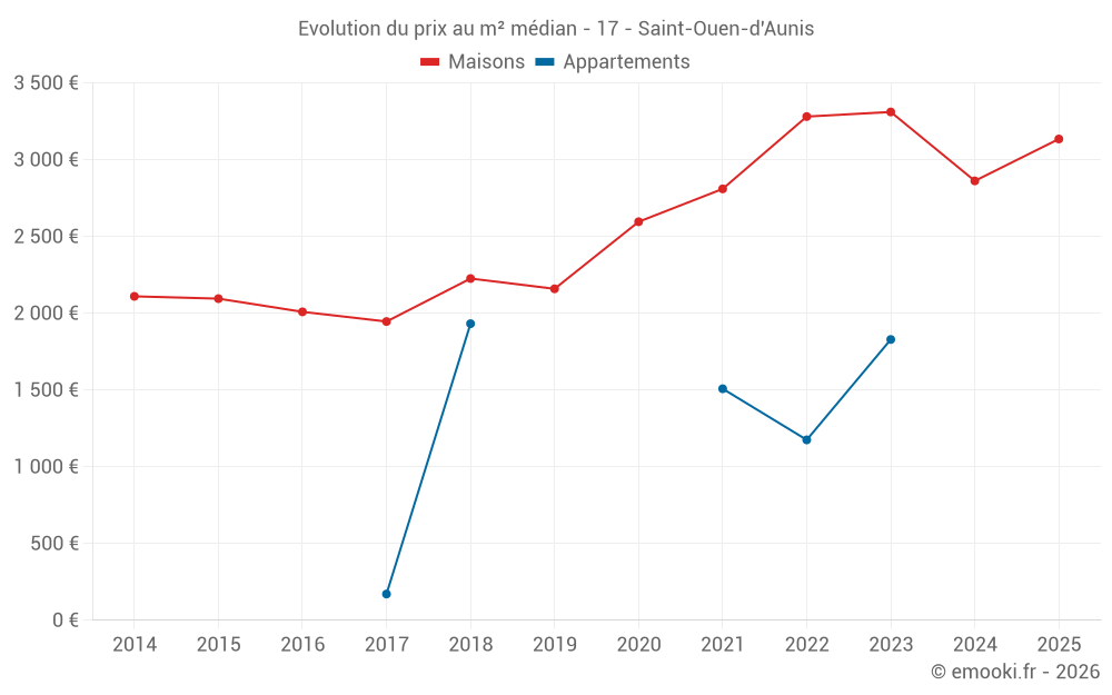 Le prix médian sur les 25 transactions de maisons des 12 derniers mois dans la commune de Saint-Ouen-d'Aunis était de 2 926 € par mètre carré pour une valeur foncière médiane de 302 780 €. Sur cette période 60% des transactions se sont situées entre 2 581 et 3 592 € par mètre carré (du 2ème au 8ème déciles).