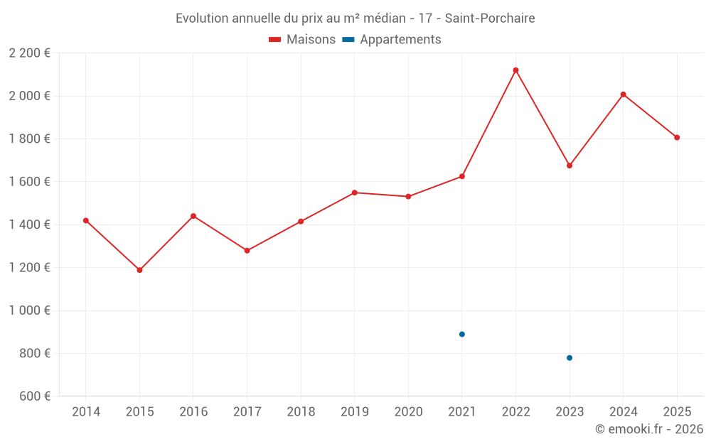 Le prix médian sur les 18 transactions de maisons des 12 derniers mois dans la commune de Saint-Porchaire était de 1 896 € par mètre carré pour une valeur foncière médiane de 190 300 €. Sur cette période 60% des transactions se sont situées entre 1 708 et 2 314 € par mètre carré (du 2ème au 8ème déciles).