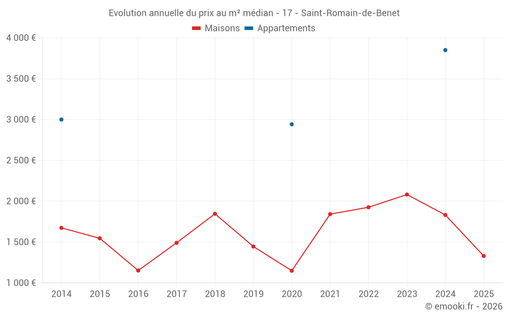 Le prix médian sur les 21 transactions de maisons des 12 derniers mois dans la commune de Saint-Romain-de-Benet était de 1 876 € par mètre carré pour une valeur foncière médiane de 205 000 €. Sur cette période 60% des transactions se sont situées entre 1 240 et 2 504 € par mètre carré (du 2ème au 8ème déciles).