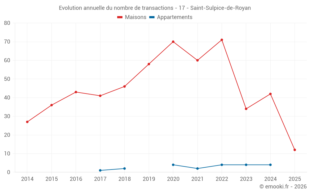 Le prix médian sur les 36 transactions de maisons des 12 derniers mois dans la commune de Saint-Sulpice-de-Royan était de 3 020 € par mètre carré pour une valeur foncière médiane de 297 975 €. Sur cette période 60% des transactions se sont situées entre 2 454 et 3 499 € par mètre carré (du 2ème au 8ème déciles).