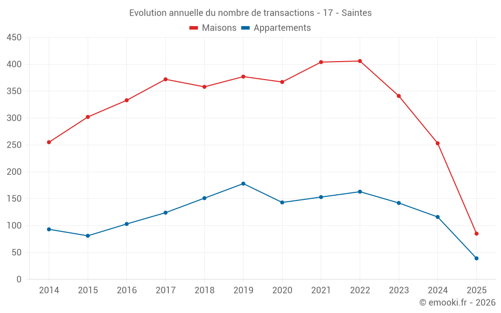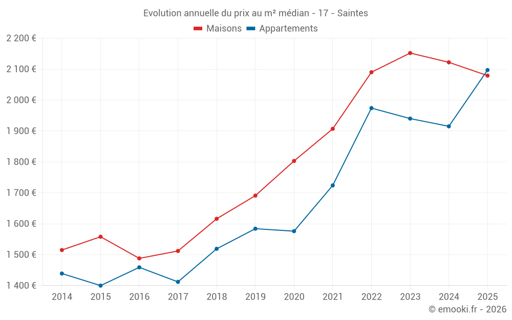 Le prix médian sur les 85 transactions de maisons des 6 derniers mois dans la commune de Saintes était de 2 079 € par mètre carré pour une valeur foncière médiane de 180 564 €. Sur cette période 60% des transactions se sont situées entre 1 385 et 2 602 € par mètre carré (du 2ème au 8ème déciles).
