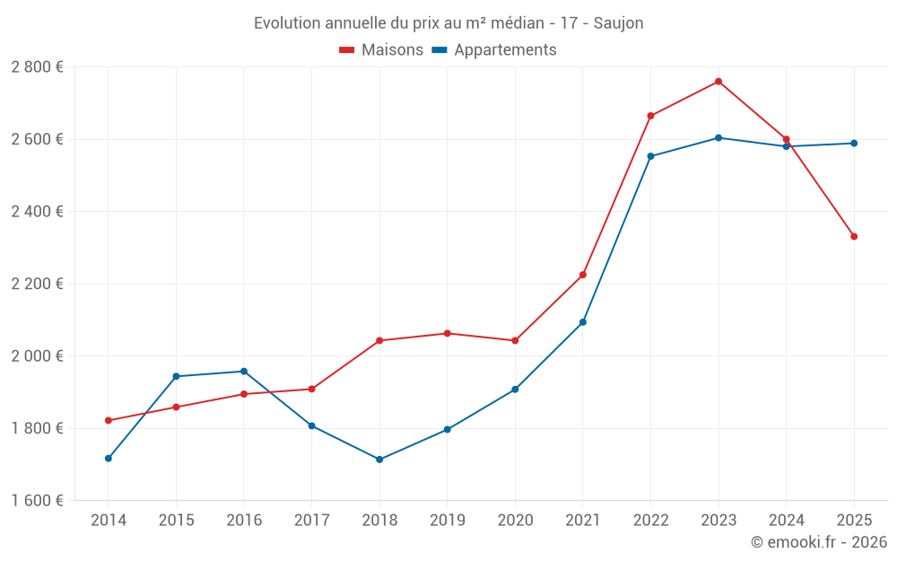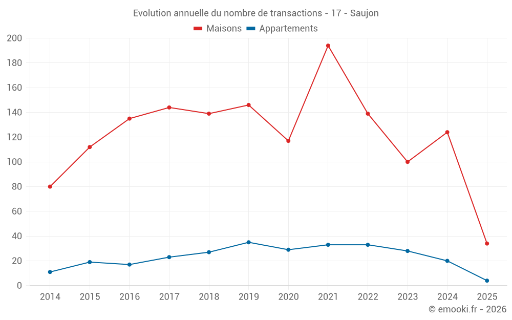 Le prix médian sur les 39 transactions d'appartements des 24 derniers mois dans la commune de Saujon était de 2 593 € par mètre carré pour une valeur foncière médiane de 141 000 €. Sur cette période 60% des transactions se sont situées entre 2 372 et 2 944 € par mètre carré (du 2ème au 8ème déciles).