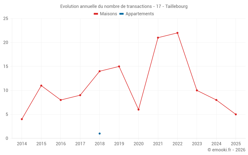 Le prix médian sur les 17 transactions de maisons des 24 derniers mois dans la commune de Taillebourg était de 1 486 € par mètre carré pour une valeur foncière médiane de 165 500 €. Sur cette période 60% des transactions se sont situées entre 988 et 2 019 € par mètre carré (du 2ème au 8ème déciles).