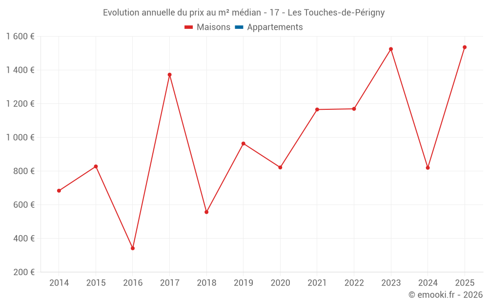 Le prix médian sur les 15 transactions de maisons des 24 derniers mois dans la commune des Touches-de-Périgny était de 885 € par mètre carré pour une valeur foncière médiane de 92 000 €. Sur cette période 60% des transactions se sont situées entre 390 et 1 580 € par mètre carré (du 2ème au 8ème déciles).