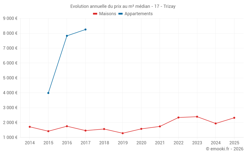 Le prix médian sur les 29 transactions de maisons des 24 derniers mois dans la commune de Trizay était de 2 096 € par mètre carré pour une valeur foncière médiane de 218 000 €. Sur cette période 60% des transactions se sont situées entre 1 464 et 2 697 € par mètre carré (du 2ème au 8ème déciles).