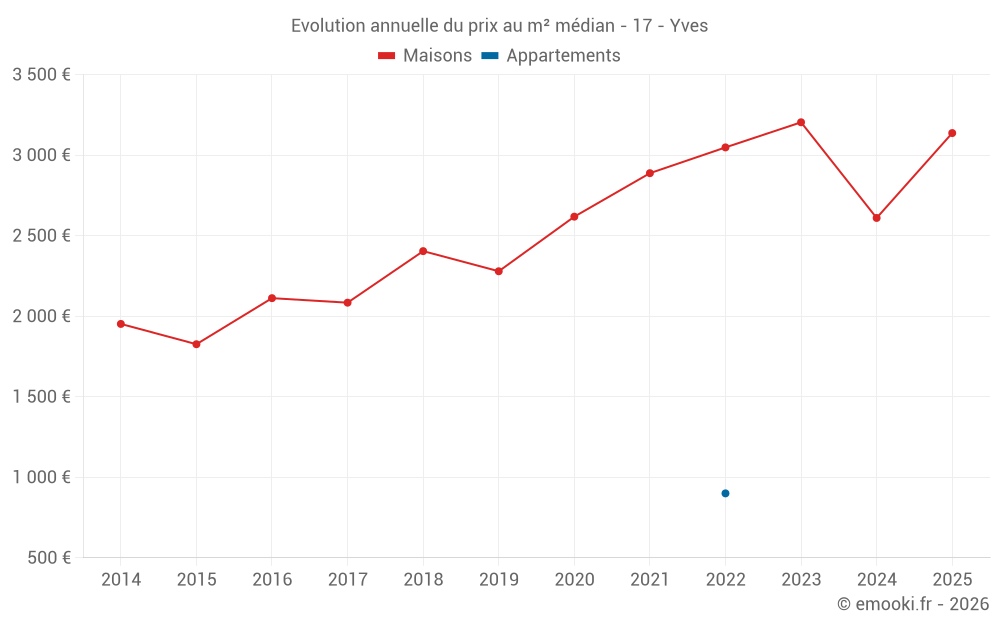 Le prix médian sur les 22 transactions de maisons des 12 derniers mois dans la commune d'Yves était de 3 137 € par mètre carré pour une valeur foncière médiane de 275 255 €. Sur cette période 60% des transactions se sont situées entre 2 659 et 4 596 € par mètre carré (du 2ème au 8ème déciles).