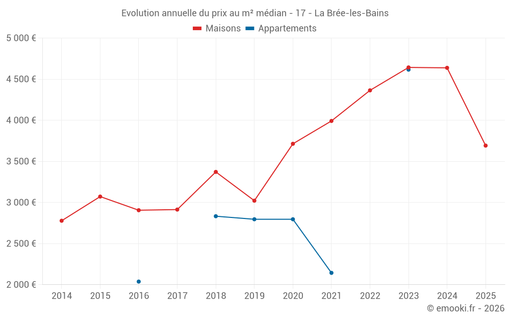 Le prix médian sur les 29 transactions de maisons des 12 derniers mois dans la commune de la Brée-les-Bains était de 4 484 € par mètre carré pour une valeur foncière médiane de 285 000 €. Sur cette période 60% des transactions se sont situées entre 3 516 et 4 866 € par mètre carré (du 2ème au 8ème déciles).