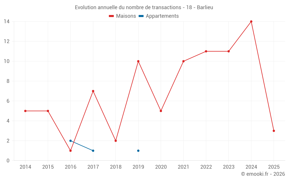 Le prix médian sur les 23 transactions de maisons des 24 derniers mois dans la commune de Barlieu était de 867 € par mètre carré pour une valeur foncière médiane de 68 000 €. Sur cette période 60% des transactions se sont situées entre 590 et 1 261 € par mètre carré (du 2ème au 8ème déciles).