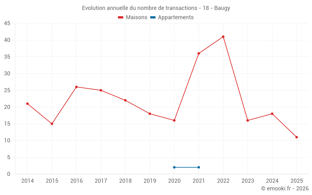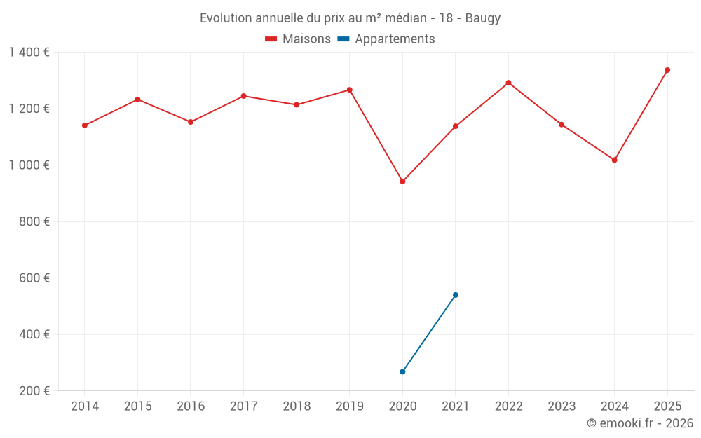 Le prix médian sur les 23 transactions de maisons des 12 derniers mois dans la commune de Baugy était de 1 337 € par mètre carré pour une valeur foncière médiane de 105 000 €. Sur cette période 60% des transactions se sont situées entre 804 et 1 495 € par mètre carré (du 2ème au 8ème déciles).