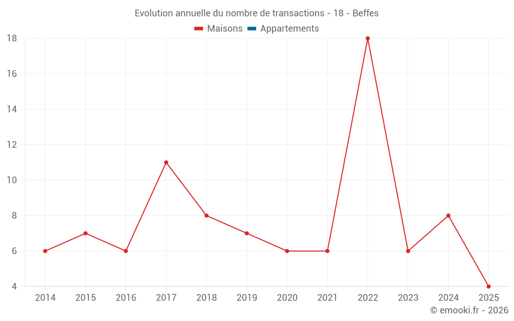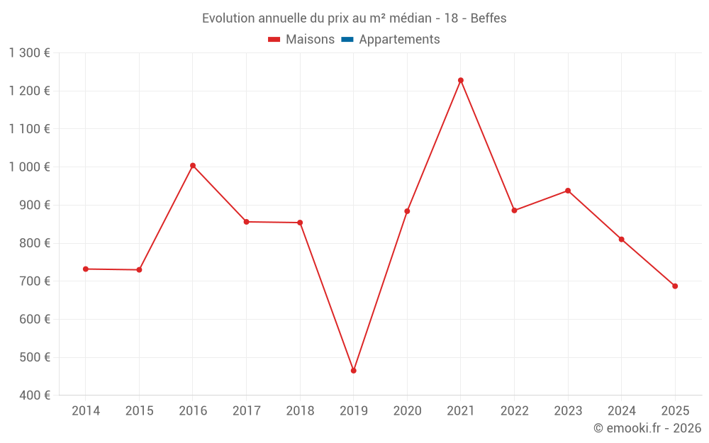Le prix médian sur les 15 transactions de maisons des 24 derniers mois dans la commune de Beffes était de 799 € par mètre carré pour une valeur foncière médiane de 65 000 €. Sur cette période 60% des transactions se sont situées entre 378 et 1 233 € par mètre carré (du 2ème au 8ème déciles).