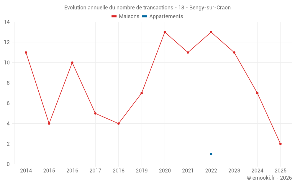 Le prix médian sur les 14 transactions de maisons des 24 derniers mois dans la commune de Bengy-sur-Craon était de 990 € par mètre carré pour une valeur foncière médiane de 110 000 €. Sur cette période 60% des transactions se sont situées entre 599 et 1 246 € par mètre carré (du 2ème au 8ème déciles).
