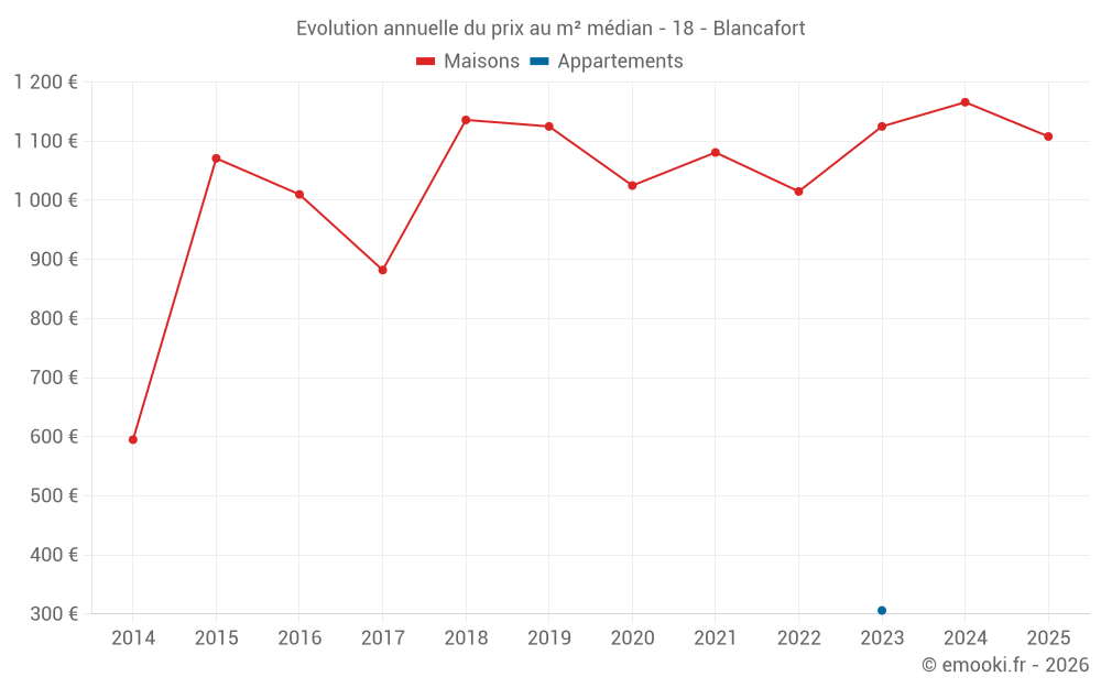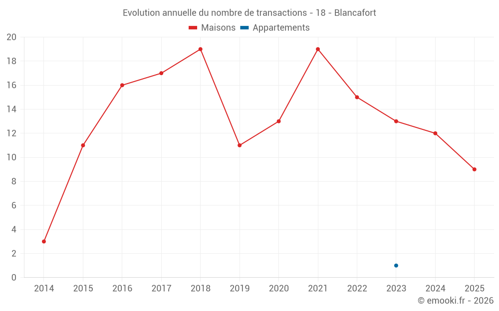Le prix médian sur les 28 transactions de maisons des 24 derniers mois dans la commune de Blancafort était de 1 116 € par mètre carré pour une valeur foncière médiane de 90 500 €. Sur cette période 60% des transactions se sont situées entre 517 et 1 422 € par mètre carré (du 2ème au 8ème déciles).