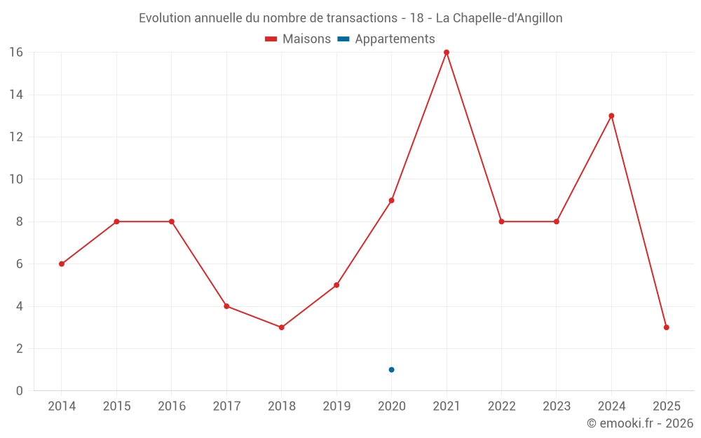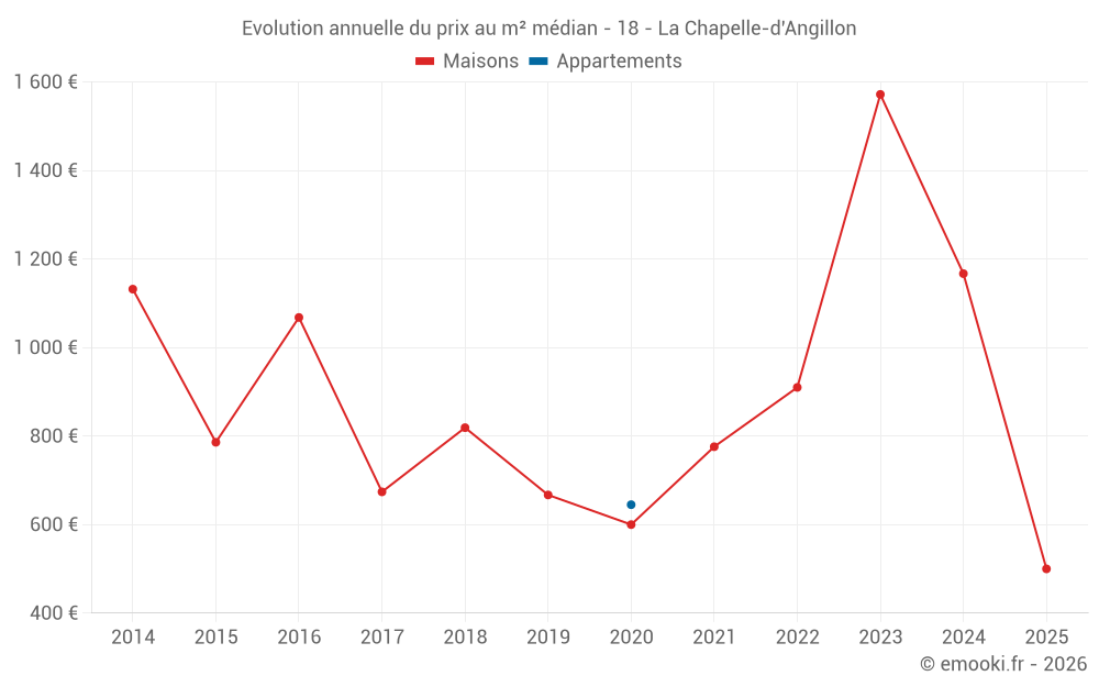 Le prix médian sur les 19 transactions de maisons des 24 derniers mois dans la commune de la Chapelle-d'Angillon était de 1 167 € par mètre carré pour une valeur foncière médiane de 100 000 €. Sur cette période 60% des transactions se sont situées entre 476 et 1 698 € par mètre carré (du 2ème au 8ème déciles).