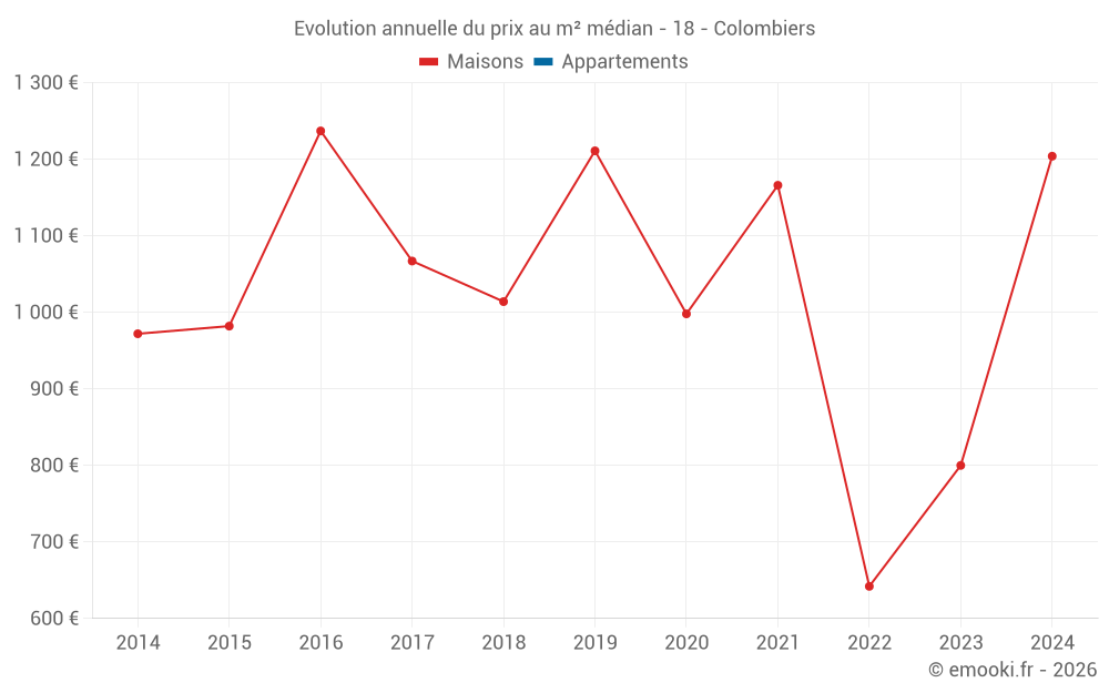 Le prix médian sur les 14 transactions de maisons des 24 derniers mois dans la commune de Colombiers était de 978 € par mètre carré pour une valeur foncière médiane de 99 250 €. Sur cette période 60% des transactions se sont situées entre 675 et 1 859 € par mètre carré (du 2ème au 8ème déciles).