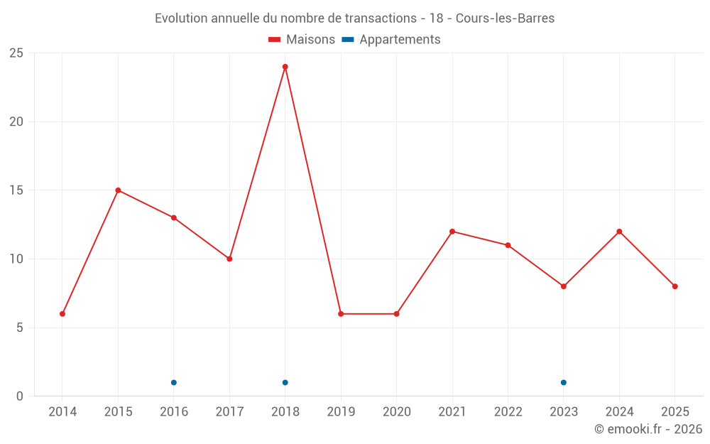 Le prix médian sur les 24 transactions de maisons des 24 derniers mois dans la commune de Cours-les-Barres était de 1 190 € par mètre carré pour une valeur foncière médiane de 124 750 €. Sur cette période 60% des transactions se sont situées entre 762 et 1 632 € par mètre carré (du 2ème au 8ème déciles).