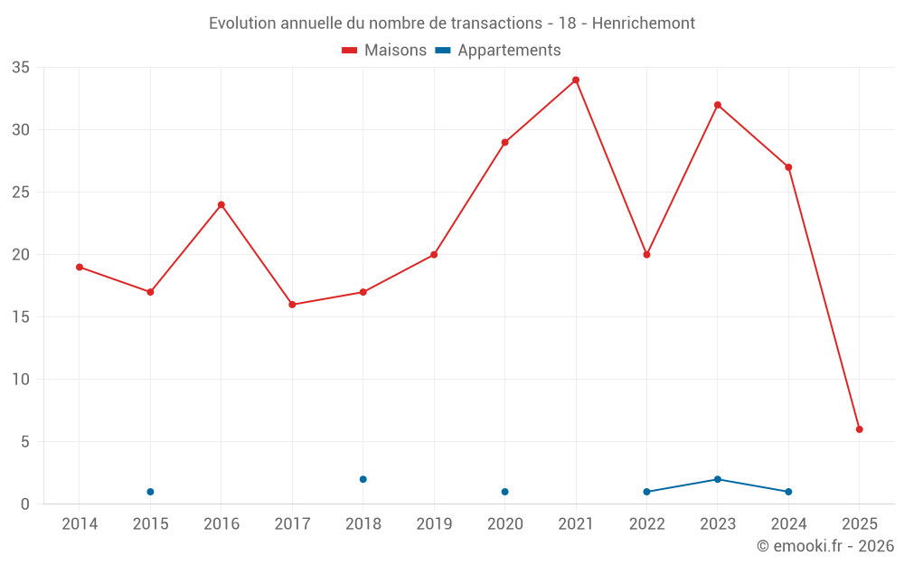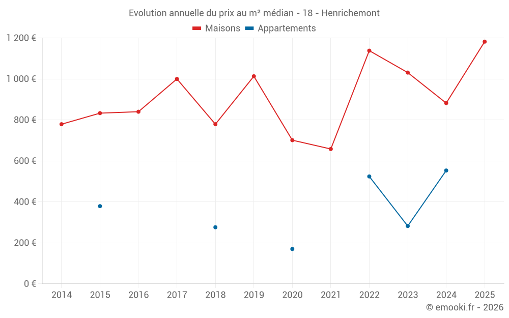 Le prix médian sur les 25 transactions de maisons des 12 derniers mois dans la commune d'Henrichemont était de 1 000 € par mètre carré pour une valeur foncière médiane de 63 000 €. Sur cette période 60% des transactions se sont situées entre 433 et 1 445 € par mètre carré (du 2ème au 8ème déciles).