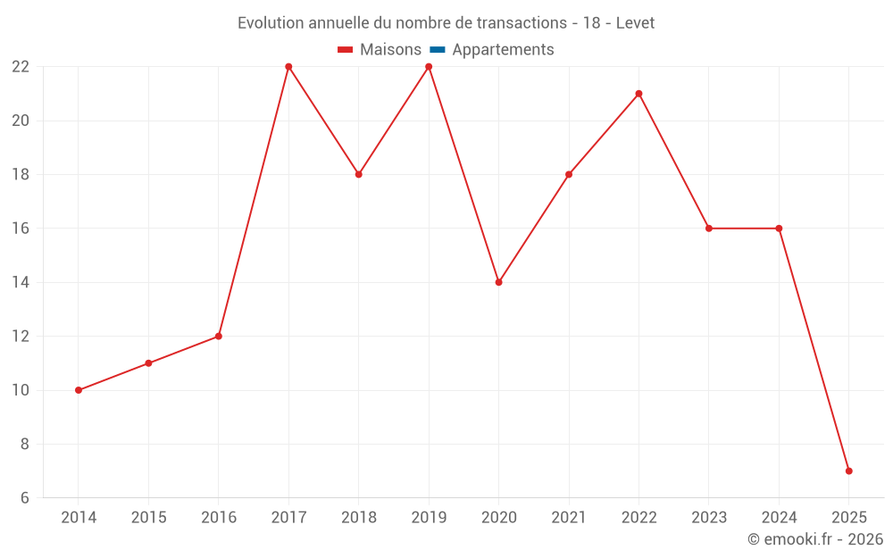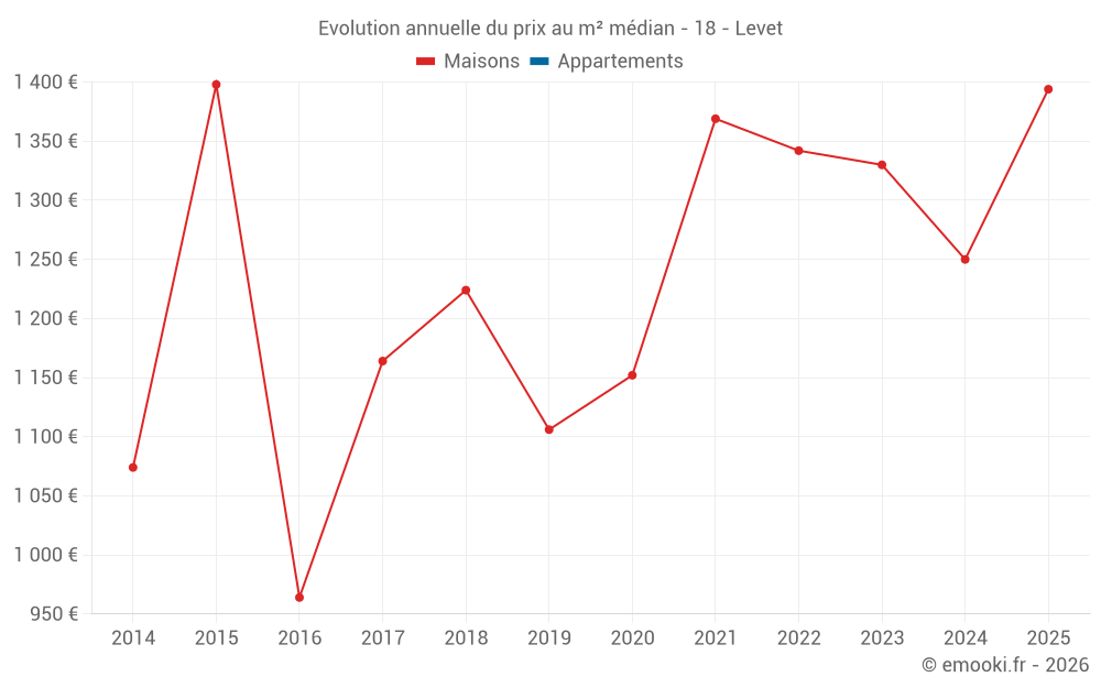 Le prix médian sur les 19 transactions de maisons des 12 derniers mois dans la commune de Levet était de 1 250 € par mètre carré pour une valeur foncière médiane de 125 350 €. Sur cette période 60% des transactions se sont situées entre 896 et 1 668 € par mètre carré (du 2ème au 8ème déciles).