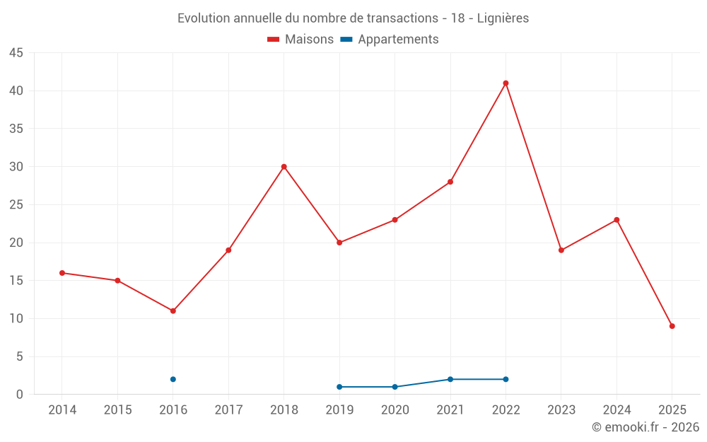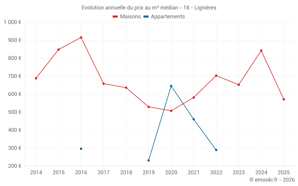 Le prix médian sur les 21 transactions de maisons des 12 derniers mois dans la commune de Lignières était de 842 € par mètre carré pour une valeur foncière médiane de 76 923 €. Sur cette période 60% des transactions se sont situées entre 399 et 1 161 € par mètre carré (du 2ème au 8ème déciles).