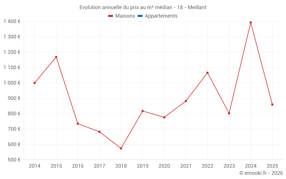 Le prix médian sur les 16 transactions de maisons des 24 derniers mois dans la commune de Meillant était de 874 € par mètre carré pour une valeur foncière médiane de 80 000 €. Sur cette période 60% des transactions se sont situées entre 563 et 1 288 € par mètre carré (du 2ème au 8ème déciles).
