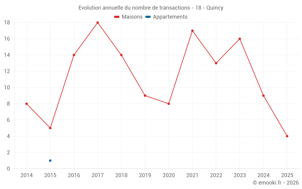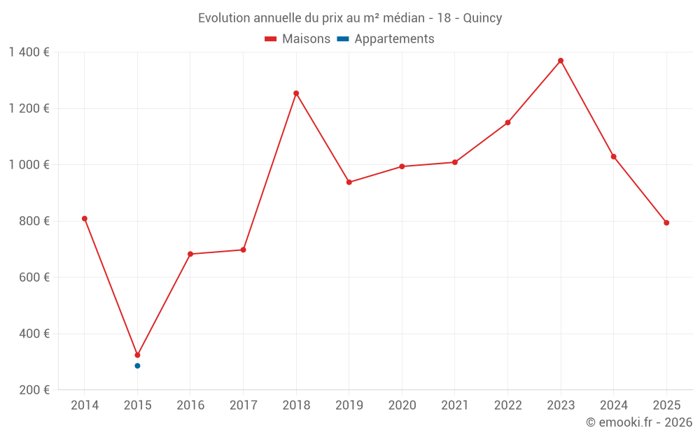 Le prix médian sur les 24 transactions de maisons des 24 derniers mois dans la commune de Quincy était de 1 140 € par mètre carré pour une valeur foncière médiane de 93 000 €. Sur cette période 60% des transactions se sont situées entre 595 et 1 563 € par mètre carré (du 2ème au 8ème déciles).